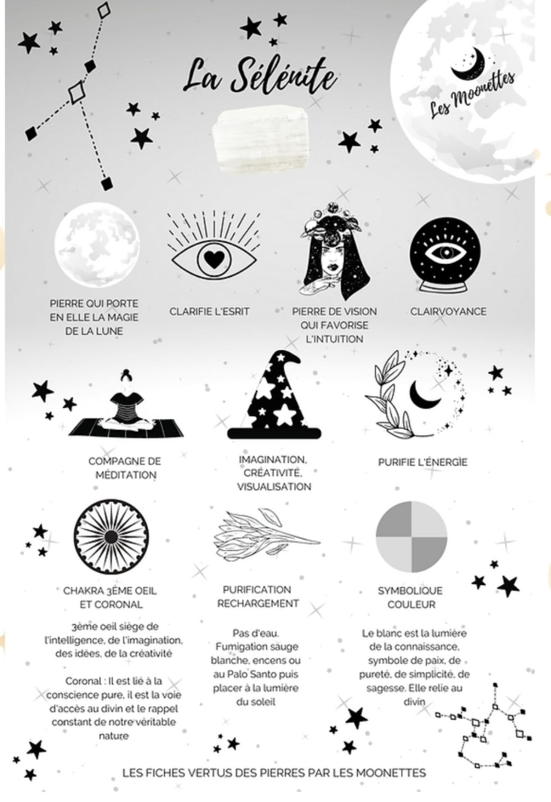 La sélénite, pierre de pureté et de lumière, agit comme un souffle divin. Elle nettoie, équilibre et élève les vibrations, guidant vers une connexion plus profonde avec sa propre essence. Elle représente la clarté, la protection lumineuse et l’amour spirituel.