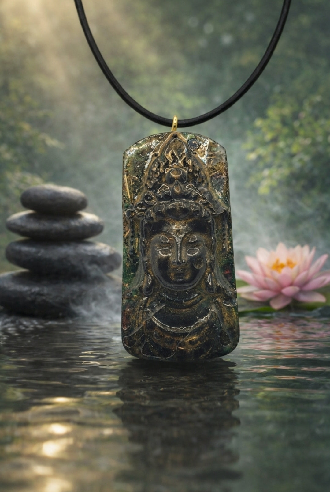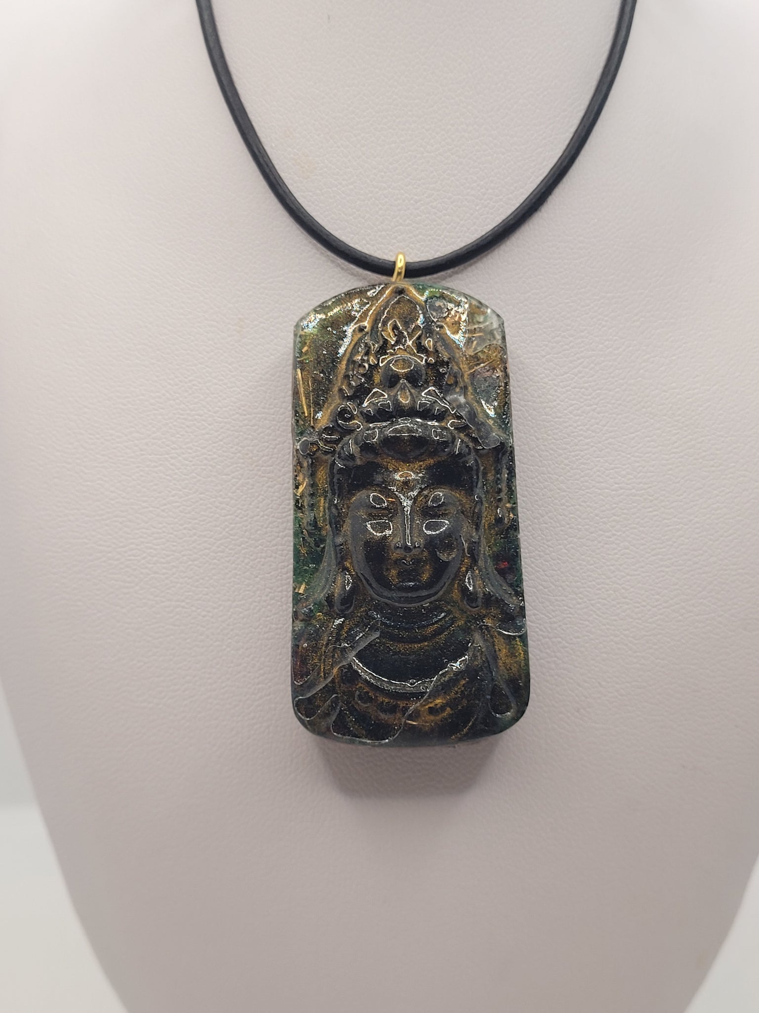 Pendentif Orgonite Bouddha-Malachite, Grenat & Tourmaline Noire