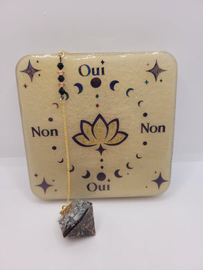 Placez votre objet divinatoire au-dessus de la planche de radiesthésie en ayant toujours fermement en tête votre question.